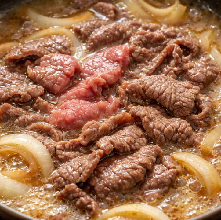 양파가 어느 정도 익으면 얇게 썬 소고기를 넣습니다. 이때 고기는 오래 끓이지 않는 것이 중요합니다. 고기가 너무 익으면 질겨질 수 있으니, 색이 변할 정도로만 익혀주세요.