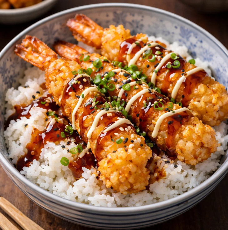 그릇에 밥을 담고 새우튀김을 올린 뒤, 준비한 소스를 살짝 뿌려 마무리합니다. 소스를 너무 많이 붓기보다는 튀김 위에 살짝 적시는 정도가 좋습니다.