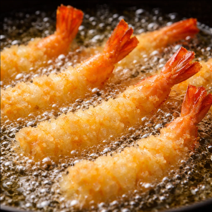 170~180도로 예열한 기름에 새우를 넣어 튀깁니다. 약 2분 정도 튀기면 바삭한 새우튀김이 완성됩니다. 야채 튀김을 함께 준비하면 텐동 구성이 더욱 풍성해집니다.